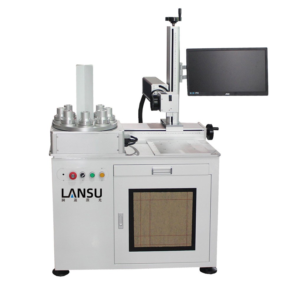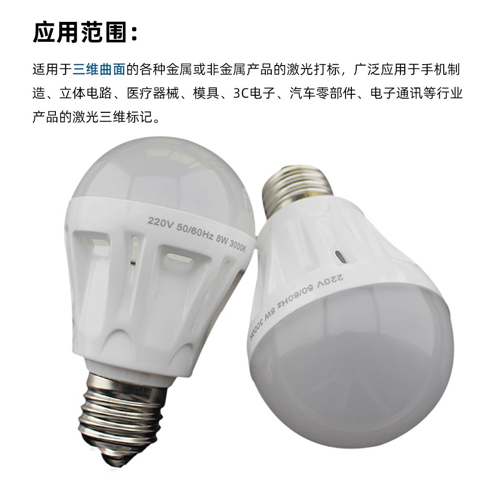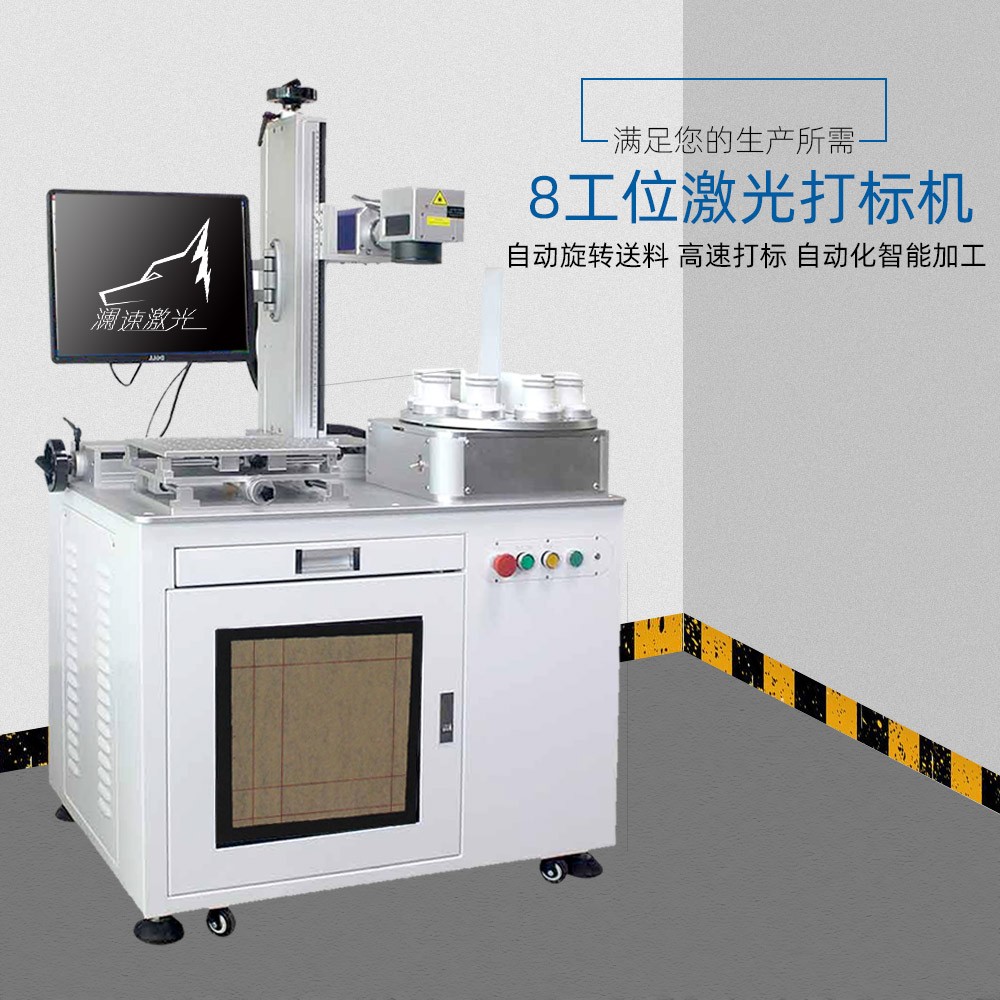 LED激光打標(biāo)機(jī)采用八工位(視產(chǎn)品具體情況可設(shè)計(jì)為6工位或4工位)3D立體旋轉(zhuǎn)轉(zhuǎn)盤設(shè)計(jì),光路X、Z軸手動移動可調(diào),單個工位之間獨(dú)立工作,自動360°旋轉(zhuǎn),減少上下料時間,提高工作效率。適用于產(chǎn)量在10K/d以上的球泡燈、要求打雙面、三面或360°旋轉(zhuǎn)打標(biāo)的產(chǎn)品等,整臺機(jī)器的操作只需要普通人工進(jìn)行手動上料一個簡易環(huán)節(jié),雙工作臺,平面打標(biāo),圓周打標(biāo)一機(jī)兩用,操作簡單,速度快,效率高,標(biāo)刻清晰,無損耗。