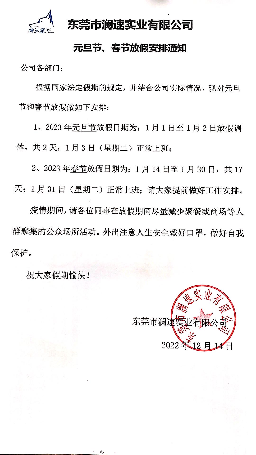 公司新聞 行業(yè)新聞 瀾速激光|關(guān)于元旦節(jié)、春節(jié)假期通知 2022-12-17 17:10:00 東莞市瀾速實業(yè)有限公司 閱讀 瀾速激光|關(guān)于元旦節(jié)、春節(jié)假期通知 發(fā)布日期:2022-12-17 17:10:00 點擊量: 喜報喜報,萬眾期待的假期通知終于出來啦!標簽:  瀾速激光 上一條手持激光焊接機降低加工成本 下一條光纖連續(xù)激光焊接機憑借自身焊接特點廣泛應用 網(wǎng)站首頁 激光焊接機 產(chǎn)品中心 解決方案 應用案例 服務支持 關(guān)于瀾速 聯(lián)系瀾速